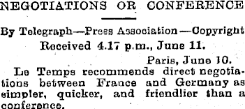 NEGOTIATIONS OR CONFERENCE By Telegraph—Press Association—Copyright Received 4.17 p.m., June 11. Paris, June 10. Le Temps recommends direct negotiations between France and Germany as simpler, quicker, aud friendlier than a conference.