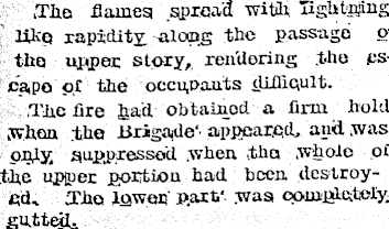 The dames spread with; lightninglike rapidity, along the passage pi the upper story, reiidoring the escape of the occupants didlpult. The dre had obtainod a firm hold When .the Brigade' appeared, and was only suppressed .when tho whole of the upjper portion had been destroyed, Tho lower part' was completely, gutted.