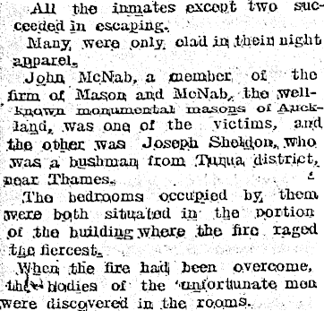 All the inmates except two succeeded in escaping, ■ Many; were only, clad in .theixj night -apparel, John McNiab, a member, of tho firm of Mason and MeNab,. tho welli.- nmvn xu,oi-u.moi::LiuL Treasons o£ AiucS—land, was one of the victims, and the other was Joseph Sheldon, Who was a bushman from Twa district, near Thames, - .The bedrooms occupied by them W.eifi both situated in the portion .of .the building where .the fire raged, tpe fiercest. When the fire had been overcome, bodies of the ‘unfortunate men .were discovered in the rooms.