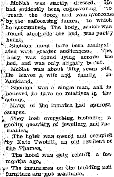 MoNab was Martly. dressed. He had evidently been endeavoring ‘to reach the door, and wan overcome *'hy the suhoeating fumes, to which ho succumbed., The body, which) was found alongside the pad, was partly burnt. *•. Sheldon must have been -asphyxiated with greater suddenness, Tho toady was found lying acro’Ss the .bed, and was only, slightly burnt. .£j McNab was about ‘fifty years .old. He leaves a, Wife and. family, inAuckland, Sheldgn was a single man, and. is believed to have no relatives ip the ‘’Colony, Many of the inmates bad, narrow, escapes. They lost everything, including a. goodly quantity flf jewellery and ya= iuables. The hotel) Whs owned and occupied bjfry Kate TwohiU,, an old resident of the Thames, The hotel was Only rebuilt a few months ago, y- The insurances on the building and furniture are sot available.