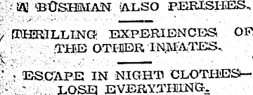 A ’•BUSHMAN' ALSO PERISHES, - THRILLING EXPERIENCES OP. ' THE OTHER INMATES. ' • ESCAPE IN NIGHT CLOTHES—LOSE EVERYTHING,