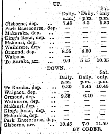 K UP. * Sat. Daily. 1 Daily ; only a.m.’ p.'m. p.m. Gisborne, dep. 7.45 4.0 9.30 Park Baoeeourse, dep. — — ■ Makaraka, dep. .. — ■ — King’s Road, dep. .. — — — Makauri, dep. — — — Waihirere, dep. — . 4.50 — Ormond, dep. 8.35 , Waipaoa — — • Te Karaka, arr. ,9.0 5 15 10.35 DOWN. Daily. Daily. only. a.m. p.m. p.m. Te Karaka. dep. 9.30 5.45 10.45 Waipaoa, dep. — — Ormond, dep. 9.55 6.10 — Waihirere, dep. .. — — — Makauri, dep. • • — ■ — King’s Road, dep. .. — — —: Makaraka, dop. — — -r— Park Racecourse, dep. — — — Gisborne, arr. 10.45 7.0 11.50 it BY ORDER.