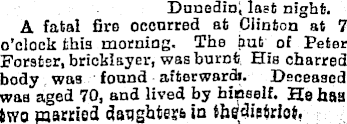 Dunedin, last night. A fatal fire occurred at Clinton at 7 o'clock this morning. The hut of Peter Forster, bricklayer, was burnt His charred body was found atterwardi. Deceased was aged 70, and lived by hinself. He has two married daughter in thedisiriof,