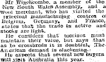 Mr Wi iielicom.be. a member of tlio •New South Wales Assembly, ami a wool merchant, who has visited the r-f-'ii'cinal manufacturing centres of Belgium, Germany,, anil France, states that the trade is active and stocks are light. He considers that merinos must maintain their value, hut says) -that as to crossbreds it is doubtful, .The/ American demand is slackening-r lit- expects that several new buyers Will visit Australia this year-