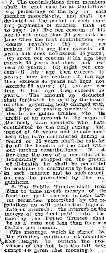 7. The Contributions from members shall in each case he at the follow--ing percentage of the pay of each member respectively, and shall be- , deducted at the period of each monithlj payments ox salaries that is to say: (a) five per, centum if bis age is not more than 30 years at the' jjame 'when the first contribution reclames payable; (b) six per Centum if his age then exceeds BO years but does not exceed 35 years ; (c) seven per centum if his ago then exceeds 35 years but does not exceed 40 years; (d) eight, per centum -if his • age then exceeds 45 years; nine per centum if his age then exceeds 4-5 years but "dojes no 5 exceeds 50 years; (f) ten per centum if has age theg exceeds 50 years. Tho amount so deducted Khali forthwith be paid by the board or other governing body charged with the 'duty of paying Teachers’ salaries to'the. public trustee '‘to the credit of an account in the name <if the'fund, Male members who have contributed to the fund d,uring the ■period of 40 years and female members who have contributed during L Period of 35 years shall- he entitled ko all the benefits of the fund without furthan contributions:. If ab Bey time the pay of a contributor is temporarily stopped on the ground 02 iH-hdalth he shall he permitted to continue to contribute to the fund ip such 'maimer and to such extent as, may be prescribed by the re* , gulaiicns. 8. The Public Trustee shall Iron time to time invest moneys of the fond or part thereof in such lawful securities prescribed by the regulations as will return the highest rats of interest ; the interest on the tnoieys of the fund paid into the fund -by the Public Trustee shall be at a rate not less than four per centum pen annum. (The message, which Ss signed by * T the Premier* oontiaues at consideriyßblo length to outline the pro- - visions of the Act, hut the full text, cannot be given this morning.)