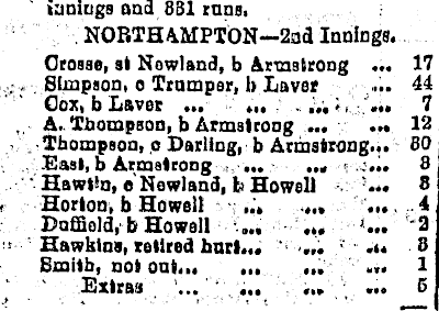 innings and 881 mas. NORTHAMPTON-2ad Innings. Orosse, st Nowland, b Armstrong ... 17 . Simpson, o Trumper, h Laver ... 44 Oox, b Laver ... ... ... •. ... 7 A. Thompson, b Armstrong ... ... 12 Thompson, p Darling, b Armstrong... BO East, b Armstrong ... ... ... 8 Hawtfn, e Newland, t> Howell ... 8 r Horton, b Howell ... .... ... 4 Duffiold, b Howell ... ... *... ‘2 Hawkins, retired hart... ... 3 Smith, not oat... ... ... ... 1 Extras ... ... ... ... 6