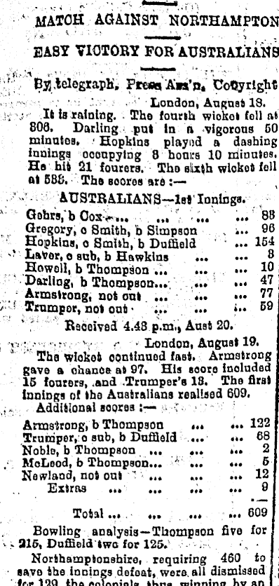 • MATCH AGAINST NORTHAMPTON EABY VICTORY FOR AUSTRALIANS ' ' Bjfi,telegraph!, Pre*aA*s’n» Copyright . London, August 18. It is raining. Tho fourth wiokol foil at 800. Darling put in n vigorous CO mlnutoß. Hopkins played a dashing innings oooupying 8 hours 10 minutes. Ha hit 2l fourers. Tho slixth wioket fell ftt 588. Tho scores are:— ( AUSTRALIANS-lsf Innings. Gohrs,‘b Cos.-... ... ... 88 Gregory, o Smith, b Simpson ... 0° Hopkins, o Smith, b Duffiold ... 154 LaVer, o sub, b Hawkins 5 Howell, b Thompson 1° Darling, b Thompson... 47 Armstrong, not out 77 / Trnmpor, not ont • ••• 59 Received 4.43 p.m., Ansi 20. v- " - f. London, August 19. Tho wioket continued fast. Armstrong gave a chance at 97. His score inolnded 15 fonrers, .and .Trumpor’s IS. The first Innings of tho Anstraiiana realised 609. Additional scores : r Armstrong, b Thompson ... ... 122 Trumper, o sub, b Dnffield ... ... 68 Noble, b Thompson ... ... ... 2 MoLood, h Thompson... ’■ ... ... 5 Newlaod, not ont ’ ... ... ... 12 Extras ... ... ... ... 9 Total... ... 609 Bowling analysis—Thompson five for - 215, Duffieid two for 125. ' c Northamptonshire, requiring 460 to j save the innings defeat, were, all dismissed c for 129. the colonials then winnina bv an .