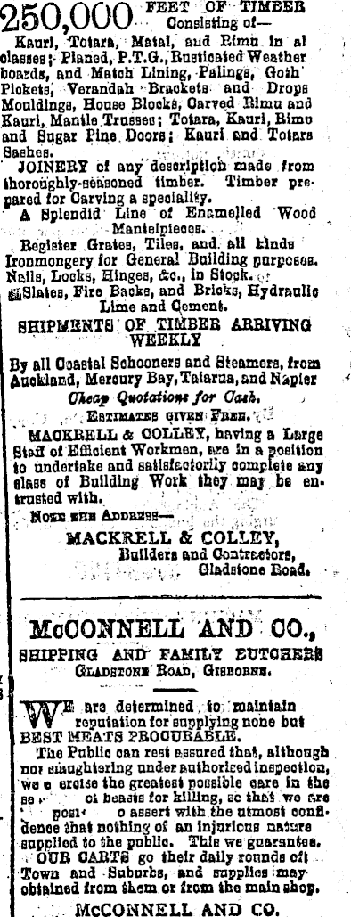 nen feet of timbeb ZiOU,UUU Consisting of— Kauri, Xotara, Matai, and Eimu In a) olasses; Planed, P.T.G.,BußtioaiedWeather boards, and Match Lining, Palings, Goth' Pickets, Verandah Brackets and Drops Mouldings, House Bloaks, Carved Bimn and Kauri, Mantle .Trasses; Totara, Kauri, Bimo and Sugar Pine Doors ; Kauri end Tolars Sashes. -v A/.- , . JOINEBY of any description made from thoroughly-seasoned timber. Timber prepared for Oarvlng a speciality. A Splendid Line of Enamelled Wood Mantelpieces. Begisier Grates, Tiles, and. all kinds I Ironmongery for General Building purposes. Salle, Looks, Hinges, &0., in Stock, c,.? Fire Backs, and Bricks, Hydraulic Lime and Clement. SHIPMENTS OF TIMBER ARRIVING WEEKLY By all Coastal Schoonerß and Steamers, from Auckland, Meroury Bay,Talarua,and Napier Cheap Quotation* for Oath. .Esxiiiazxb oiveh Fees. \ o MAOKBELL & COLLEY, having a Large Stall of Efficient Workmen, are in a position to undertake and satisfactorily complete any glass of Building Work they may be en> trusted with. ' MOEB *EH ADDBaSB—MACKEELL & COLLEY, Builders and Contractors, •, . Gladstone Bond, McGQNNELL AND 00., SHIPPING ANir FAMILY BUTCHERS Gmdbxoki Boad, Gisboehh. ■flS/Ei are determined, to. maintain v V reputation for supplying none but BEST MEATS PBOOUBABLE. The Public can rest assured that, although noi slaughtering under authorised inspection, wa e eroise the greatest possible care in the ee *■ cl beasts for killing, sc that we fire ‘ posi< o assert with the utmost oonfl* Senoe that nothing of an injurious nature supplied to the public. This we guarantee, , OtJB CASTS go their daily ronnda oft Town and Suburbs, and supplies-may obtained from them or from the main shop. McConnell and cq.