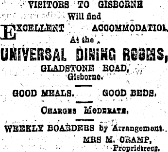 YISITOBB TO GIBBOBHH Will find -EXCELLENT ACCOMMODATION At the / GLADSTONE BOAD, Gisborne. GOOD MEALS. GOOD BEDS. Oeaeges Modeeaißi WEEKLY BOA3DKBS by Arrangement.. MBS M. OBAMP, ' Proprietress.