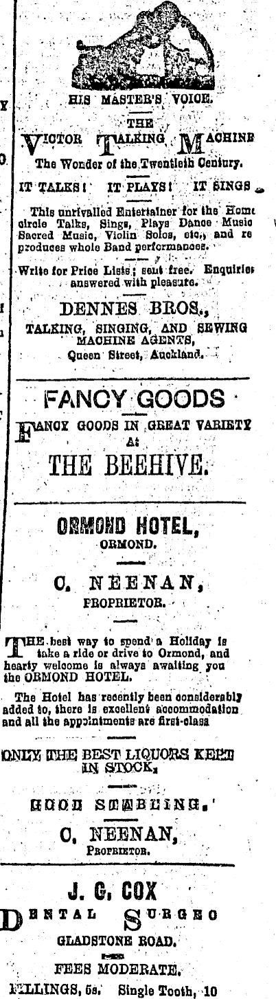 ;; ■ .ms master's, ymoe. THE % '.’ v fpALimo ■ iyg-AqaiHß The Wonder of the Twentieth Century. IT TALES t IT FLAYS t IT SINGS . This unrivallod Entertainer for the Eonu circle Talkß, Singe, Flays Dance Music \ Baored Music, Violin Solos, eto,» and re produces whole Band performances. •Write for Price Lists ; sent free. Enqulriet answered with pleasure. « - * dennesTbeos,, TALKING, SINGING, AND SEWING 1 MACHINE AGENTS, J Queen Street, Auckland, FANCY_GOODS F 4 NOT GOODS IN GREAT VABIET2 At THE BEEHIVE. ORMOND HOTEL, OBMOND. G, NEENAN, PROPRIETOR. rilHE.hesi way to spend a Holiday is JL take a ride or drive to Ormond, and hearty welaome Is always awaiting you the OBMOND HOTEL. The Hotel haß recently been considerably added to, there is excellent accommodation and all the appointments are first-clasa ONESS £EHE BEST LIQUORS KEE3Q m STOCK, raoon sfflffißunss, 1 0, KEEN AN, PaorEiKioß. J. lii COX JJ B H T A L GLADSTONE ROAD, FEES MODERATE. FILLINGS, Gs, Single Tooth, 10 gDBB 1 0