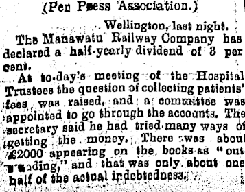 (Pec F*esa Association.) ; j Wellington, lasi night, j The Mahawata Bailway Company has aeolared a half-yearly dividend of 8 per cent. At to-day’s meeting of the Hospital Trustees the qaestion of collecting patients’ ifees was raised, and: a' eommittse was Vappointed to go through the accounts, The vseoretary said he had tried many ways of tcelting the . money. There was about appearing on the. books as "out--■-lading,” and that was only, about oneb«U of the aotual indebtedness. .■ j