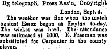 By telegraph, Press Ass’n, Copyright London, Sept. 4. Tho weather was fine when the matoh against Essex began at Leyton to-day, The wioket was hard. The attendance was estimated at 1000, E. Freeman was substituted for Carpenter in tho county eleven.