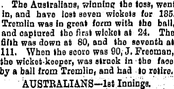 . The Australians, winning the toss, went in, and have lost seven wickets for 185. Tremlin was in great form with the ball, and captured tbo first wioket at 24. Tho fifth was down at 80, and the seventh at 111. When the sooro was 90, J. Freoman, the wicket-keeper, was struck in the face by a ball from Tremlin, and had to retire. AUSTRALIANS—Ist Innings.