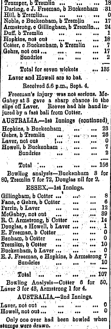 Tramper, b Tremlin ... 18 Darling, o J. Freeman, b Baokenham 81 Hill, b Tremlin 0 Noble, o BnokeDbam, b Tremlin 17 Armstrong, o Gillingham, b Tremlin.. 24 Doff, b Tremlin 1 Hopkins, not out 18 Goiter, o Baokenham, b Tremlin ... 7 ; Gehrs, not oat... ..... 17 Sundries ... 2 Total for seven vvlokets ... 185 Laver and Howell are to bat. Reooived 5.6 p.m„ Sept. 4. Freeman’s injury was not serious. Mo. Galley at 8 gave a sharp ohanoo in tho slips' off Laver. Beeves had his hand injured by a fast ball from Cotter. AUSTRALIA.—1st Innings (continued). Hopkins, b Baokenham ... ... 28 Gehrs, b Tremlin ... ... ... 26 Laver, not out !... ... ... 0 Howell, b Baokenham - 7 Sundries 2 Total !... ... 156 Bowling analysis—Baokenham 8 for 60, Tremlin 7 for 72, Douglas ml for 2, ESSEX.—1st Innings. Gillingham, b Cotter ... ...' 8 Fane, o Gehrs, b Cotter 6 Perrin, b Laver 12 MoGahey, not out 89 B. C. Armstrong, b Cotter 14 Douglas, e Howell, b Laver ... 1 ... 1 E. Freeman, b Cotter 0 Benbam, b Cotter 0 Tremlim, b Cotter 10 Baokenham, b Laver ... 0 E. J. Freeman, o Hopkins, b Armstrong 7 Sundries • ... 10 Total ... ... 107 Bowling Analysis—Cotter 6 for 60, Ldver 3 for 48, Armstrong 1 for 4. AUSTRALIA.—2nd Innings, Laver, not ont ... ... 0 Howell, not out 0 Only one over had been bowled when slumps were drawn.