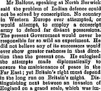 Mr Balfour, speaking at North Berwick said the problem of Indian defenoe opuld not be solved by consoription. No country in Western Europe ever attempted, or would attempt, to employ a conscript army to defend far distant possessions. The present Government would never be responsible for so wild an experiment. He did not believe any of its-successors would ever show greater rashness in that direction than the present one. He eulogised tho attempts made diplomatically to ensure the maintenance of peaoe in the Far East j yet Britain’s right must depend in the long run on Britain’s might. Distinguishing next between an invasion of England on a grand soale, which was im-