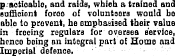 p actioable, and raids, which a trained and sufficient force of volunteers would be able to prevent, he emphasised their value in freeing regulars for oversea service, hence being an integral part of Home and Imperial defence.