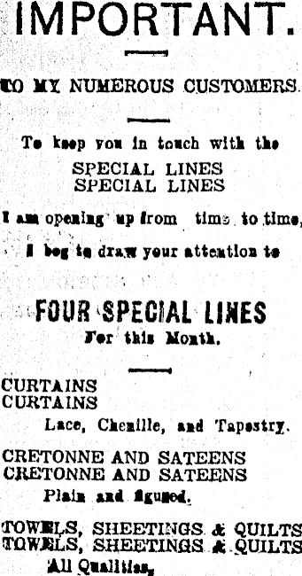 IMPORTANT. 10 MX NUMEROUS CUSTOMERS. Te katp vo* In toich with the SPECIAL LINES SPECIAL LINES lam opening' np from tlma to time, I heg t« dra* yem attention t* FOUR SPECIAL LINES F*r this Month. CURTAINS ’ CURTAINS Lace, Chenille, and Tapestry. CRETONNE AND SATEENS CRETONNE AND SATEENS Plain and flguged. TOWMUS, SHEETINGS A QUILTS TOWELS, SHEETINGS A. QUILTS All QnallMaa,