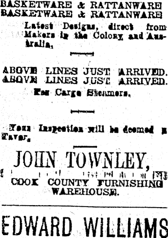 BASKETWARE A RATTANWARH BASKETWARE A RATTANWARE Latest D«*lgu, dlract from' AUkura | * &• Coloax uiAu* iralia, ABOVE LINES JUST ARRIVED. ABOVE LINES JUST ARRIVED. Em .Care* fiiiejiaaara, J»n lutMtlMi mil ba g EaTir a JOHN 1 i 1 ‘' 1 n i rsr| COCA COUNTY rURNISHINO WAREHOUSE. EDWARD WILLIAMS
