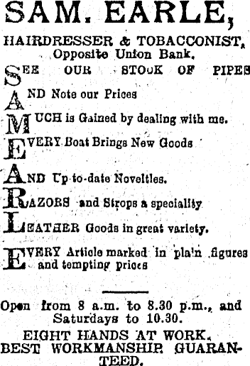 SAM. EARLE, HAIRDRESSER Sc TOBACCONIST, Opposite Union Bank. gES OUJtt BTOoK OF PIPES A ND Note oar Prioes UCH is Gained by dealing with me. JpiVERY Boat Brings New Goode ' And Up-to-date Novelties. *T> JJUAZOBS and Stropß a speciality IiHATHEB Goode in great variety. JgVEBY Article marked in plain .figures and tempting prices Open !tom 8 a.m. to 8.30 p.m., and Saturdays to 10.30. EIGHT HANDS AT WORK, BEST WORKMANSHIP. GUARANTEED.