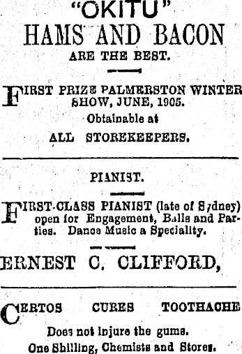 “OKITU” HAMS AND BACON ABE THE BEST. ÜBST PRIZE PALMERSTON WINTER SHOW, JUNE, 1903. Obtainable at ALL STOREKEEPERS, PIANI3T. First-class pianist (i&te of s?dney) open for Engagement, Balia and Partiea. Danoa Moslo a Speciality. ERNEST C,”CLIEEORD, £jEBTOS CUBES TOOTHACHE Does not injure tbe guma. One Shilling, Ohemista and Store*.
