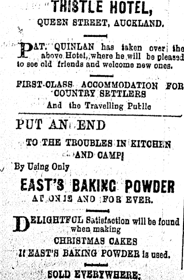 THISTLE HOTEL, QUEEN BIBEET, AUCKLAND. PAT. QUINLAN has taken overi the above Hotel,;where he .will be pleased to soe old friends and welaome new ones. FIRST-CLASS ACCOMMODATION POB ' COUNTRY SETTLERS And the Travelling Pallia PUT AN* END TO THE TROUBLES IN KITCHEN AND CAMP] By Using Only EAST’S BAKING POWDER AT ON IS ANO 'FOB EVER. DELIGHTFUL Satisfaction will be found when making CHRISTMAS OAKES If EAST'S BAKING POWDER Is used. . SOU) EVERYWHERE;