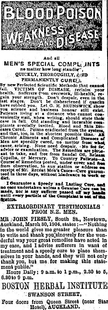 And all MEN’S SPECIAL COMPLAINTS no matter how long, standi*'”, QUICKLY, THOROUGHLY, ft/STD PRRMANKNTLY CUREQ. By tiew Perfected Scientific Methods that cannot fail. VICTIMS OF 1)1 MR ASK, reclaim Your health. Sufferers f-om overwork, ill-health, ree*ln your strength. Don’t despair, even in tint last stage*. Don't be disheartened if quacks hare robbed you. Let G. K. BRUNSWICK Show rots science and business honour atill exist. Patients living st a distance who cannot conveniently visit, when writing, should state thefc case in full. Old standing and incurable complaint* specially invited. Blood and Skin Bfc>eases Cured. Poison eradicated from the system, •nd that, too, in the shortest possible time.* Ah Chronic Ailments and Complicated Dtaeooea of Men are speedily cured, no matter from what cause, arising. None need despair. <No fee advice or examination. The Remedic* are pleasant to take, and free from Sandal Oil, Balaam Copaiba, or Mercury. To Country Patteicta—A Course of Remedies posted, under cover and free from observation, to nuy station or addiern oa receipt of JO/: Recent Men's Casco-Cure ruuran. teed in throe days, without hindrance l« (reek or diet. I Guarantee a Speedy and Lasting Cure, awS no cnee undertaken unless a Genuiue Cure caata made, aor is any eafitret passed oJT nr hada evory poetic]* of the Qoauplaiat is oat of Urn EXTRAORDINARY TESTIMONIALS FROM N.Z. MEN. MR JOHN PIESLY, South St., Newtown, Auckland, Marohßo,l9o4, etates“Nothing in the world gives me greater pleasure than to write and thank you;slnowely for the wonderful way your groat remedies have noted in my ease, and I advise sufferers in want of treatment and a speedy cure to plaoo themselves in your handß, and they will not only thank you, but me. lor making this statement publio." Hours Daily; 9 a.m.to Ip.m., 2.30 to 6, 6.80t0 9 p.m. BOSTON HERBAL INSTITUTE SWANSON STREET, Four doors from Queen Street (near Star Hotel), AUCKLAND.