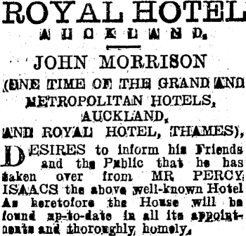 ROYAL HOTEL muo*a a a d. JOHN MOEKISON l (BNE time oe .the .grand bend METROPOLITAN hotels, AUCKLAND, AND ROYAL HOTEL, THAMES), BESIRES to inform hit Friends and th* Public that he has taken orer from MR PERCY ISAACS the above gr ell-known Hotel Ae heretofore the Homse .will he foend in all its anolgti a eats and thoroughly homely,