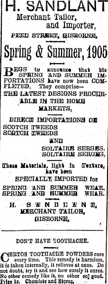 H. SANDLANT Merchant Tailor, and Importer, PEED STREET, GISBORNE, Spring & Summer, 1905 BEGS to annoinca that hla SPRING AND SUMMER IMPORTATIONS kave now been COMPLETED, They comprise— THE LATEST DESIGNS PROCURABLE IN THE HOME MARKETS. DIRECT IMPORTATIONS OX SCOTCH TWEEDS SCOTCH TWEEDS AND SOLTAIRB SERGES. SOLTAIRS SERGES. These Mfcturials,, light In Teitiri, hare been SPECIALLY IMPORTED !oe SPRING AND SUMMER WEAR. SPRING . AND SUMMER WEAR. H. SHINDU AN T, MERCHANT TAILOR, GISBORNE, DON’T HAVE fOOTHAGHE. CERTOS TOOTHACHE POWDERS onre every time. This remedy is harmless, it in taken internally, it relioves at onoe. Do not doubt, try it and see how Barely it cares. No other remedy like it, no othar so] good, i Price Is. Chemists and Stores,