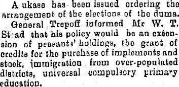 A ukase has been issued ordering the arrangement of the elections of the duma. General Trepoff informed Mr W. T. Strad that his policy would be an extension of peasants’ holdings, tbo grant of credits for tho purchase of implomonts and stock, immigration from over-populated districts, universal compulsory primary education.