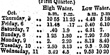 (First Quarter.) High Water. Low Water. Oet. a.m. p.m. a.m. p m Thursday, o .. 10 55 11.25 .. 4.48 518 Friday, 6 .. 11.49 .17 ... 5.40 8.10 Saturday, 7 .. .40 1.9 ..6.31 7. Sunday, 8 .. 125 1.80 .. 7.90 7.50 Monday, 9 2. 2,20 ..8.19 8.10 Tueaday, 10 .. 2.50 3.13 .. 9.3 9.80 Wednesday, 11 3,42 4.5 .. 9.63 1020