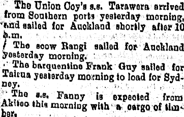 The Union Ooy's s.s. Tarawera arrived irom Soulhern ports yesterday morning, ’laid sailed for Auckland shortly after 10 b.m. r Tho scow Rangl sailed for Auckland Yesterday morning. • Tho barquentine Frank Qny sailed for Takua yesterday morning to load for Syd.,t. b 0 Fann 7 is oxpaoted from Akitoo this morning with a oatrgQ of timb9f*