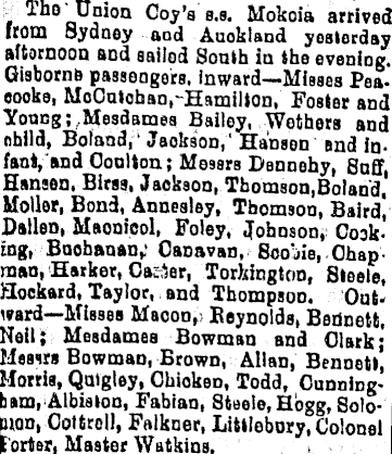 b °a^?* on Q°y' a ®-®- Mokoia arrived from Sydney and Auokland yesterday aitornoon and sailed South in the evening. Gisborne passengers, inward—Misses Peaeooke, MoOutohan,-Hamilton, Foster and Young j Mesdames Bailey, Wethors and child, Boland,' Jackson,' Hanson end infant, and Oonlton; Messrs Dennehy, Snfif, Hansen, Birss, Jackson, Thomson,Boland, Moller, Bond, Annesley, Thomson, Baird', Dallen, Maoniool, Foley, Johnson, Cookmg, Buchanan,: CaDavan, Booaie, Chapman, Harker, Ca;-Ser, Torkington, Steele, Hockard, Taylor, and Thompson. Out. ward—Misses Maccm, Reynolds, Bennett, Neil; Mesdamea Bowman and Clark; Messrs Bowman, Brown, Allan, Bennett, Morris, Quigley, Chicken, Todd, CuDningbam, Albiston, Fabian, Steele, Hogg, Solohod, Coltroll, Falkner, Littlebury, Colonel E'ortsr, Master Watkins.
