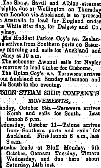 .TheSbavy, Savill and Albion steamer Mphic, due at-Wellington on Thursday rom Loudon via Auokland, Is to proceed o Australia to load for England under he While Star flag, for Dalgety and Co., lydney. ilha Huddart Parker Coy’s s.s. Zealan. i» arrives.from Southern ports on Satursy morning and sails for Auckland aud ydney at 10 a.m. The schooner Awanui sails for Napier i-morrow to load timber for Gisborne. The D.nlon Coy's s.s. Tarawera , arrives om Auckland on Sunday afternoon and iia South fa the evening, NIQN STEAM SHIP. COMPANY’S MOVEMENTS* inday, October Bth.—Tarawera arrives North aud sails for South, Last launch 5 p.m. ednesday, Ootober 11—Taiune arrives from Southern ports and sails ' for I Auckland. First launoh 6 a.m., last I 8 a.m. lanaka loads at Bluff Monday, 9th I October, Oamaru Tuesday, Timaru I Wednesday, and dne here about I Saturday, 14th iust.