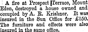 A fire at Prospect |Terraoe, Mount Eden, destroyed a house owned and occupied by A. R. Krishner. It was insured in the Sun Office for £l5O. The furniture and effects were also insured in the same office.