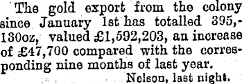 The gold export from the colony since January Ist has totalled 395,130 oz, valued £1,592,203, an increase of £47,700 compared with the corresponding nine months of last year. Nelson, last night.