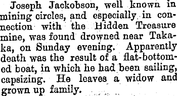 Joseph Jackobson, well known in mining circles, and especially in connection with the Hidden Treasure mine, was found drowned near Takaka, on Sunday evening. Apparently death was the result of a flat-bottom-ed boat, in which he had been sailing, capsizing. He leaves a widow and grown up family.