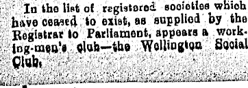 Io tho lift of registered sooiotiea whioh have ceased to exist, aa supplioi by the Kogistrar to FftrliamßDt, appears a work-Jng-mqo'e plub—the WelliogtQa B<joial Gtab.