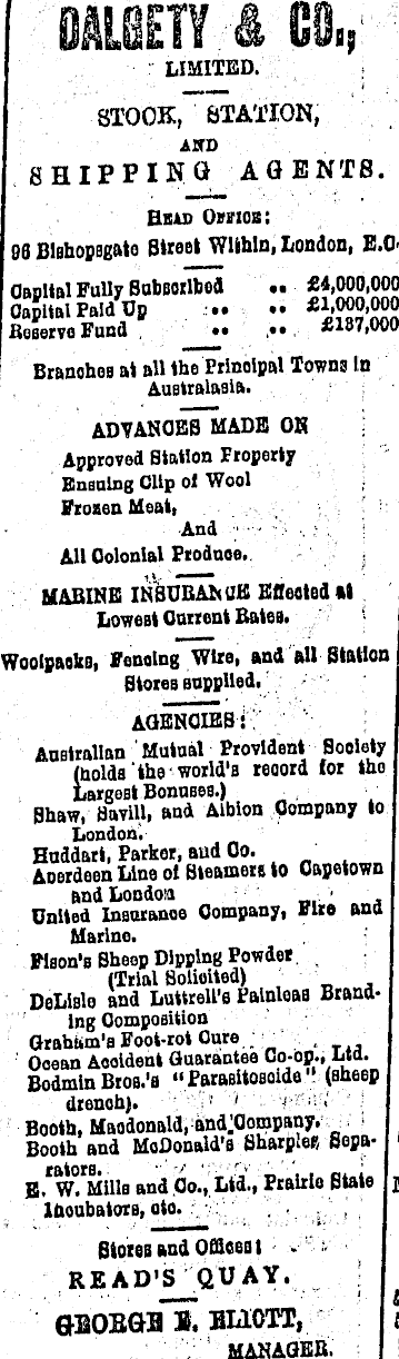 LIMITED. STOCK, STATION, AHD SHIPPING agents. Hiud Oman: 96 Blshopßgate Street Within, London, E.OCapital Fully Subscribed Capital Paid Up ••• Reserve Fund •• £4,000,000 £1,000,000 £187,000 Branohoa at all the Prlnolpal Towns In Australasia. ADVANCES MADE OK Approved Station Property Ensuing Clip ol Wool Frozen Meat, And All Colonial Produce. MARINE INSURANCE Efleoted It Lowest Current Rates, Voolpaokß, Fenolng Wire, and all Station Storea supplied. AGENCIES: Australian Mutual Provident Boolely (Uolda the world's reaord for the Largest Bonuses.) Bhaw, Savill, and Albion Company to London. Huddart, Parkor, aud Co. Aoerdeen Line ol Steamers to Capetown and London United Insuranoe Company, Fire and Marine. Flaon's Sheep Dipping Powder. (Trial Solicited) DeLlsle and Luttrell’s Painless Brand Ing Composition Graham’s Foot-rot Cure Ooean Aooident Guarantee Co-op., Ltd. Bodmin Bros.’s " Paraßitosoide (sheep drenoh). 1 ■ > Booth, Maadonald, and^Oompany. Booth and McDonald's Sharpies SepaB. r w°. r Mllla and Co., Lid., Prairio State lhoubators, oto. Stores aud Offices i - READ'S QUAY. GEOBGKB 1. ELIOTT, MANAGES.
