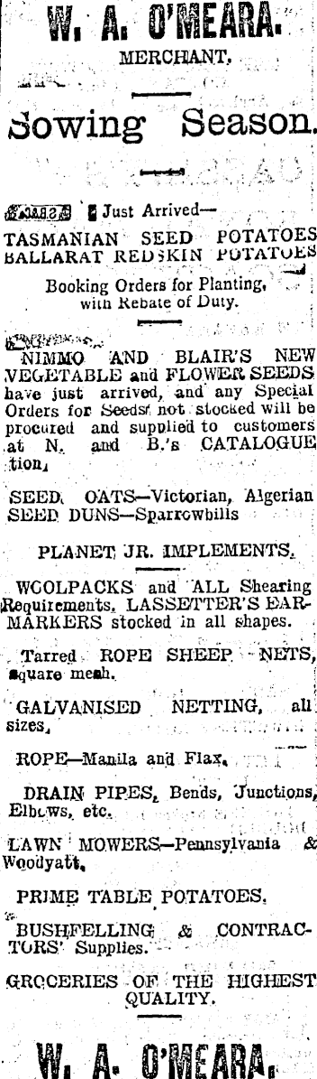 i. A. O'MEARA. MERCHANT, '.*& • * . i Sowing Season. .. I L. Awl. ' -j*. '■ MMM G Just Arrived— TASMANIAN SEED POTATOES BALLARAT REDSKIN POTATOES Booking Orders for Planting, witn Rebate of Duty. NIMMO AND BLAIR'S NEW VEGETABLE and FLOWER SEEDS have just arrived, and' any Special Orders for Seed si* not stocked will be procured and supplied to customers .at N, and B.'s CATALOGUE tionj SEED, OATS—Victorian, Algerian SEED DUNS—Sparrcwbills PLANET JR. IMPLEMENTS, WCOLPACKS and ALL Shearing Requirements. LASSETTER’S EARMARKERS stocked in all shapes. . , Tarred ROPE SHEEP - NETS, Square mesh, GALVANISED NETTING, all sizes, ' v.; ROPE—Manila and Flax, DRAIN PIPES, Bends, 'Junctions, Elbows, etc. .' ; - :■ I ,| LAWN MOWERS—Pennsylvania & Woodyatt, I: PRIME TABLE POTATOES, "bushfelling a contractors’ Supplies. GROCERIES OF THE HIGHEST quality.
