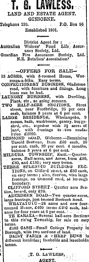 T. S. LAWLESS. LAND AND ESTATE AGENT, GISBORNE. Telephone 193. P.O. Box 96 Established 1891. District Agent for : Australian Widows’ Fund Life Assurance Society, Ltd. Guardian Fire Assurance Sooiety, Ltd. N.Z. Retailers’ Association.' . -OFFERS FOR SALE--12 ACRES, with 5-roomed House, Wae-renga-a-hlka. Easy terms. CON EEC HONE BY BUSINESS, Gladstone road, with furniture and fittings. Long t lease can bo bad. LAUNDRY BUSINESS, with Dwelling, Plant, etc, as going. conoorn. TWO HALF-ACRE SEC HONS, Stout street, near Footbridge, 25 per cent cash, balance 3 joirs at 6 per cent. LARGE RESIDENCE, Whataupoko, 9 rooms, bath, washhouse, pantry, bufgyshrd, cio., tcgother with 3J acre, ol land, with frontage to-, two roads.Price. £2OOO. DESMOND RO&D, Gisborne.—Remaining Unsold Sections, from £SO each, 20 per cent, cash, 20 per cent. 4 months, balance 3 years at 6 per cent. " . MILDUBA TOWNSHIP, Haiti.—Quarteracres, Half-acres, and Acres, from £SO, £BO, and £130; very easy terms. THREE SPLENDID BUILDING SECTIONS, on Clifford street, at £BO eaeti, on easy term 3 ; also, Section, witu large frontage, on Ormond road, at boiough boundary. CLIFFORD STBEEX- Quarter acre Section, fenced, only £75. : ABERDEEN ROAD—Two quarter-acres, large frontage, just beyond Roebuck Road. WHATATU'IU—£B aores and new fourroomed House, £4OO terms £'2( | o cash, balance for four years at,6 per cent. TE KaBAKA —Several half-acre Sections in this ris’ng TowDsbip, for sale on easy terms. ; _ . i ’ £lB5 CASH —Small Cottage Property in Borough, with two sections of land. , DAIRY FARMS & <• HEEP BUN'S in different localities; freeholds and leaseholds, terms. t T. G. LAV/LESS, AGENT.
