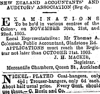 NEW ZEALAND ACCOUNTANTS’ AND AUDITOR'S’ ASSOCIATION (Reg d).. EX A M I N A T I ,0 N 6 To be he'd in various centres ol the Colonv, on NOVEMBER 20tti, 21st, and 22nd, 1005. Local Reprrsentat&tive: Mr Thomas A. Coleman, Public Accountant, Gladstone Rd. APPLICATIONS muet reach the Registrar not later than OCTOBER 2lst. 1905. J. H. MACKIE, Registrar. Mercantile Chambers, Queen St., Auckland NICKEL - PLATED Coat-hangers, only 4£d; Trouser-hangers, only 6d each. About ball usual price. Every Gent, should use these,—-C* Bosia and Ca. . ------ -