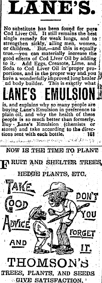 LANE’S. No sQbstituto has been foutjd for pure Cod Liver Oil. It still remains the best single remedy for weak lungs, and to ' strengthen sickly, ailing men, women, or children. But,—and this is equally true.—you can materially increase the ! good effects of Cod Liver Oil by adding . to it. Add Eggs, Creasote, Lime, and t Soda to Cod Liver Oil in'proper pro- 5 portions, and in the proper way and you It' have a wonderfully improved lung healer nd body builder. This is exactly what L LANE’S EMULSION is, and explains why so many people are buying Lane's Emulsion in preference to plain oil, and why the health of these people is so much better than formerly. Buy . pane’s Emulsion (chemists or stores) and take according to the directions sent with each bottle, 161 NOW IS THE TIME ,TQ PLANT JJI RUIT AND SHELTER TREES, HEDGE PLANTS, ETC, D ONT PO YOU FoggET k m AMD THOMSONS TREES, PLANTS, AND SEEDS GIVE SATISFACTION. 1