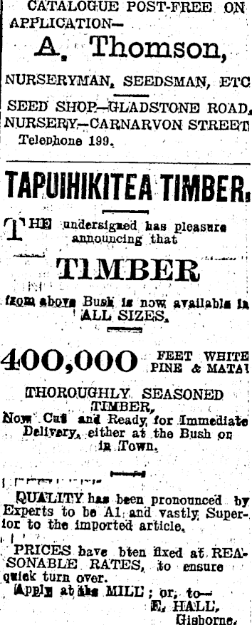 CATALOGUE POST-FREE ON APPLICATIONA. Thomson, NURSERYMAN* SEEDSMAN, ETC SEED SHOP—GLADSTONE ROAD* NURSERY,-CARNARVON STREET Telephone 199. TAPUIHIKITEA TIMBER, Q 1 HE undersigned has pleasnre -L. announcing that ~~ TIMBER t*sm ftbon Busk l* now available U ' ALL SIZES* 4,00 000 WHITES < ±V/l/»UUU PINE & MATA I THOROUGHLY SEASONED . . TIMBER, Nojs Cal anil Ready for .'lmmediate Delivery, either at the Bush ps i* Town. ; ;rnwiQUALITY ha* been pronounced by Experts to be AL anil vastly Superior to the imported article. il' 7 . PRICES have bten fixed at REASONABLE RATES, to ensure qeiefc turn aver. APfill atitt* MILL ; or, to—> Ei HALL', Gisborne,