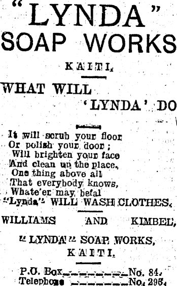 LYNDA” SOAP WORKS HAITI, WHAT WILL * LYNDA * DO H will scrub your floor Or polish your door ; Will brighten yqur lace Arid clean m the place, Ono thing above all That everybody knows, ■ Whate’er may befal -‘‘Lynda’i WILD WASH .CLOTHES, WILLIAMS AND KIMBEL’, K LYNDA « SOAR .WORKS, K All TI, P.O. Bofl6---ZuZr-.wi.Ntf. 84, Telepboai No, 298,