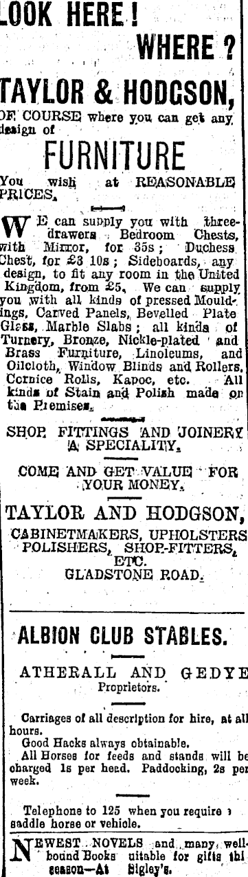 LOOK HERE! WHERE? • » f TAYLOR & HODGSON, Oil COURSE where you can get any, design of FURNITURE Yon wish at REASONABLE PRICES* , x " WE can supply yea with threedrawers Bedroom Chests, with Minor, for 355; Duchess Chest, for £3 10s; Sideboards, any design, to lit any room in the United Kingdom, from £5, We can supply you with aU kinds of pressed Mould' ings, Canved Panels,, Bevelled Plate Glssa, Marble Slabs ; all kinds of Turnery, Bronze, Nickie-plated 1 and Brass Furniture, Linoleums, and Oilcloth,. Window Blinds and Rollers, Cornice Rolls, Kapoc, etc. AU kinds of Stain and Polish made or tat Premises* ! SHOE AND JOINERY A SPECIALITY* COME AND GET VALUE FOR YOUR MONEY* TAYLOR ANtT HODGSON, CABINETMAKERS, UPHOLSTERS POLISHERS, SHOE-FITTERS, ETC. GLADSTONE ROAD. ALBION CLUB STABLES. ATHERALL AND GEDYE Proprietors. ’ Carriages of all description for hire, at all hours. Qood Hacks always obtainable. All Horses lor feeds and stands will be charged Is per head. Paddookiog, 2s per week. Telephone to 125 when you require 3 saddle horse or vehiole. NEWEST NOVELS and many) wellbound Books uitable for gifts thi season—At Blglay’s.