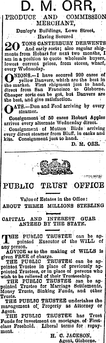 D. M. ORR, PRODUCE AND COMMISSION MERCHANT, Dunlop's Buildings, Lowe Street, Having Secured TONS CANTERBURY DERWENTS And early sorts; also rogular shipments from Hobart for next two months, X am in a position to quote wholesale buyers, lowest ourrent prioes, from stores, wharf, every Wednesday. ONIONS.— I have scoured 200 oases of yellow Danvers, which are the best in the market. First shipment just to hand, direot from Ban Francisco, to Gisborne. Cheaper sorts oan be got, but Danvers are the best, and give satisfaction. OATS.— Dun and Food arriving by every steamer. Consignment of 50 oases Hobart Apples arrives every alternate Wednesday direot. Consignment of Mutton Birds arriving every direot steamer from Bluff, in oasks and kits. Consignment just to hand. D. M. ORB. PUBLIC trust office Value of Estates in the Offiao: ABOUT THREE MILLIONS STERLING CAPITAL AND INTEREST GUAR ANTEED BY THE STATE. THE PUBLIC TRUBTEE can be appointed Executor of the WILL of any person. ADVICE as to the making of WILLS is given FREE of oharge. THE PUBLIC TRUSTEE oan be appointed Trustee in place of previously appointed Trustees, or in place of persons who wish to be relieved of their Trusteeship. THE PUBLIC TRUSTEE oan bo apjointed Trustee for Marriage Settlements, Honey Trusts, Sinking Funds, and other Crusts. THE PUBLIC TRUSTEE undertakes the management of] Property as Attorney or Agent. THE PUBLIC TRUSTEE has Trust Funds for Investment on mortgage., of - Firstjlass Freehold. Liberal terms for repayment. H. 0. JACKSON, Agent, Gisborne.