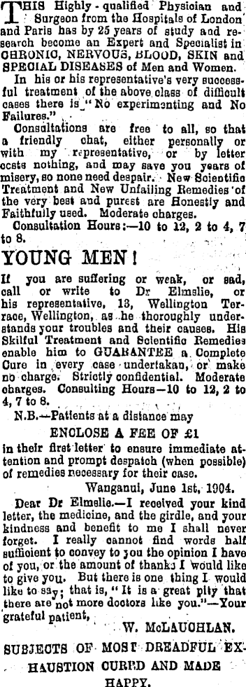 THIS Highly - qualified Physician and Surgeon from the Hospitals of London and Paris has by 25 years of study aad research become an Expert and Specialist in CHRONIC, NERVOUS, ELOOD, SKIN and SPECIAL DISEASES of Men and Women. In his or his representative's very Buooess-. ful treatment of the above olass of difficult cases there is w “N6 experimenting and No Failures.” . Consultations are free to all, so that a friendly ohat, either personally or with my representative, or by letter ocsts nothing, and may save you years of misery, so none need despair. New Soientifio Treatment and New Unfailing Remedies'of the very beat and purest are Honestly and Faithfully used. Moderate oharges. Consultation Hours:—lo to 12, 2t04, 7 to 8. i YOUNG MEN! If you are suffering or weak, or sad, oall or write to Dr Elmslie, or his representative, 13, Wellington Terraoe, Wellington, as he thoroughly understands your troubles and their causes. His Skilful Treatment and Scientific Remedies enable him to GUARANTEE a. Complete Cure in every aase - undertakan, or make nh oharge. Strictly confidential. Moderate oharges. Consulting Hours—lo to 12, 2to 4,7 to 8. : \ N.B.—Patients at a distance may ENCLOSE A FEE OF £1 in their first letter to ensure immediate attention and prompt despatch (when possible) of remedies necessary for their oase. Wanganui, June Ist, 1904. I Dear Dr Elmslie.—l reoelved your kind letter, the medicine, and the girdle, and your kindness and benefit to me I shall never forget. I really oannot find words half sufficient to convey to jou the opinion I have of you, or the amount of thanks I would like to give you. But there is one thing I would like to 83y; that is, “ It is a great pity that there are not more doctors like you.”—Your grateful pati en^» W. McLAUQHLAN. SUBJECTS OF MOSr DREADFUL EX'H4.USTION CURED AND MADE HAPPY.
