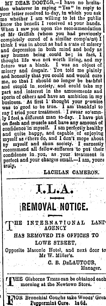 MY DEAR DOOT6B,—I have no hesitation whatever in eaying “Yea" in reply to your letter received to-day, in whioh you ask me whether I am willing to let the puklio know the benefit I reoeived at your hands. When 1 eaw you upon the recommendation ot Mr Griffith (whom you had previously completely cured of a similar complaint) I think I was in about as bad a s'ate of misery and depression In both mind and body as any human being .could be; in fact, I thought life was not worth living, and my future was a blank. I was an objeot of misery and despair. You told me plainly and honestly that you could and would cure me, bo that I should no longer be baehful and stupid in, society, and could take my part and interest in the amusements and sports of othen and have an ambition in my business. At first 1' thought your promise was to good to be true. I am thankful to say I tried your treatment. I swear so'om.nly I feel, a different man to-day. I have put on flesh" and muscle and,have any amount of confidence in rnyßelf. lam perfcotly healthy and quite happy, and capable ,of enjoying myself as ethers do, and I don’t mope about by myself and shun society. I earnestly recommend all fellow-sufferers to put' their confidence in..you, as your treatment is perfect and your ohargos Bmall.—l am, yours truly, LACHLAN CAMERON. LLA.' (REMOVAL NOTICE. rpHE INTERNATIONAL LANP X AGENCY HAS REMOVED lIS OFFICES TO LOWE STREET, Opposite Masonic Hotel, and next door to Mr W. Miller's. C. B. DeLAUTOOB, Manager. f inHE Gisborne Times can be obtained eaoh JL morning at the Newtown Store. IjrtOß Bronchial Coughs take Woods' Grea 2 Peppermint Cure. IsOd.