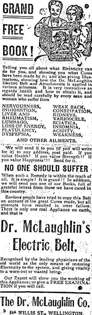 GRAND e r FREE Telling you all about what Electricity can ' do for you, and showing you what Cures nare been made by it; and also giving Illustrarlons, showing how the Dr. McLaughlin Electric Belt and Attachments is applied in various ailments, ft is very instructive as regards .health and how to obtain it, and should be read carefully by every Man and woman who suffer from NERVOUSNESS, INDIGESTION, LIVER AND RHEUMATISM, LUMBAGO, LOSS OE ENERGY, FLATULENCY, DYSPEPSIA, AND OTHER WEAK BACK, CONSTIPATION, KIDNEYS, VARICOCELE, SCIATICA, INSOMNIA, ACIDITY, WEAKNESS, AILMENTS. We will send it to you (if you' will Write for it) to any address, post paid. If you value Health! If you value Strength I! If you value Happiness 111 Send for it. NO ONE SHOULD SUFFER When such a Remedy is within the reach of all. It is simple I It is grand !! In addition, we will send you one of our Books, full of grateful letters from those we have cured in ; this country. * f Envious people have tried to copy this Belt on account df the great Cures made, but all attempts have resulted in utter failure. There is only one real Appliance on earth, and that is Dr. McLaughlin’s Electric Belt, Recognised by the leading physicians of the old world as the only means of restoring Electricity to the system, and giving vitality to a worn-out or wasted being. Our Expert will show you the working of this Appliance; or give a FREE EXAMINATION if you will call. . g The Dr. McLaughlin Co. s 54* WILLIS ST„ WELLINGTON.