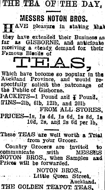 THE TEA OE THE DAY. MESSRS IioTON BROS. pleasure in stating that they have extended their Business as far a a GISBORNE, and anticipate receiving a steady, demand tor their Famous Blends of TEAS, Which have become so popular in tha Auckland Province, and would respectfully solicit the patronage of the Public of Gisborne, PACKETS—I Pound an'd J Pound* TINS—2% 61b, 121 b, and 201 b FROM ALL STORES, PRICES—Is, Is 4d, Is 6d, Is Bd, la 10d, 2b, anil 2s 6d per lb 4 These TEAS are well worth a Trial from your Grocer. Country Grocers are Invited to communicate with MESSStS NOTON BROS., when Samples and Prices will be forwarded. NOTON BROS., • Little Queen Street, Auckland. THE GOLDEN .TEAPOT .TEAS,